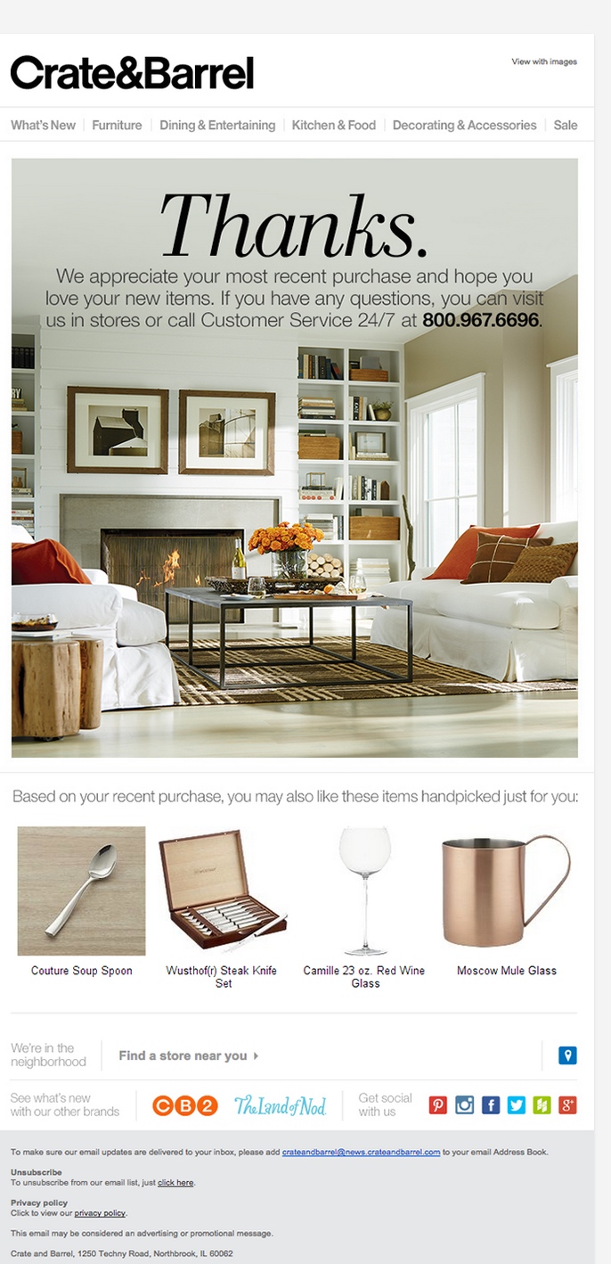Например, в первом письме вы можете поблагодарить их за покупку и продемонстрировать дополнительные товары, которые у вас есть в наличии. Вот пример от Crate&Barrel: