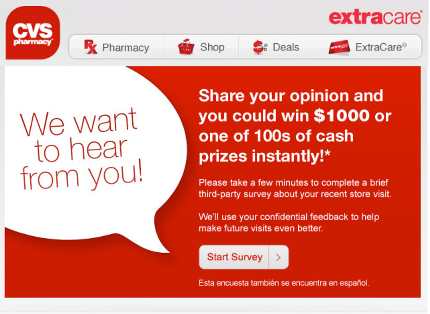 - Объясните, что в этом для них. Если вы хотите, чтобы клиент потратил время на заполнение опроса, вы должны указать ему причину. В приведенном ниже примере от CVS участники участвуют, чтобы выиграть денежный приз.