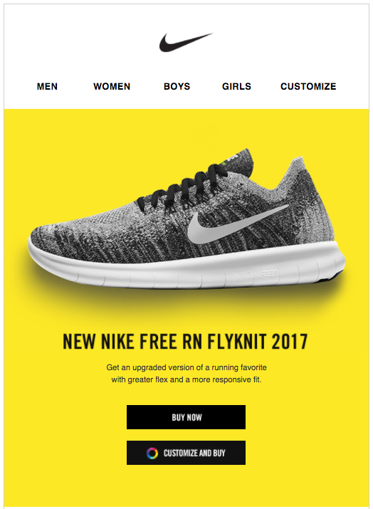 - Сделайте убийственный снимок. Вам не нужно быть вычурным, но вам нужно продемонстрировать свой новый предмет. На самом деле, эти типы электронных писем больше связаны с фотографиями, чем с текстом. Возьмем, к примеру, письмо ниже. Все дело в картинке. Всего несколькими словами Nike доносит свою мысль.