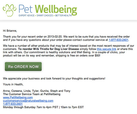- Упомяните прошлые покупки. Если вы хотите, вы можете указать в электронном письме, что ваш клиент купил в прошлом, чтобы они могли повторно заказать то же самое. Магазин товаров для животных, представленный ниже, делает это для своих клиентов. Это приятное дополнение к электронному письму, но вы можете отправить его без этой информации.