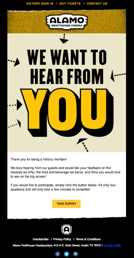 - Сделайте опрос легкодоступным . Должна быть очевидная кликабельная ссылка на опрос. Взгляните на пример ниже. Обратите внимание, что ссылка на опрос представляет собой четкую, легко заметную кнопку в нижней части электронного письма.