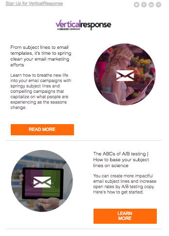 - Включите свою контактную информацию в информационный бюллетень. Вы всегда хотите, чтобы ваша контактная информация была легкодоступной в информационном бюллетене. Цель вашего информационного бюллетеня не обязательно состоит в том, чтобы продавать, но если ваши клиенты вдохновлены связаться с вами из-за информационного бюллетеня, вы хотите, чтобы они могли вас найти. Вы можете разместить кнопки контактов социальных сетей в верхнем или нижнем колонтитуле вашего сообщения; вы можете пойти более традиционным путем и указать свой номер телефона и адрес электронной почты; или вы могли бы сделать и то, и другое. В приведенном ниже примере из нашего собственного информационного бюллетеня VerticalResponse вы заметите кнопки социальных сетей в правом верхнем углу: