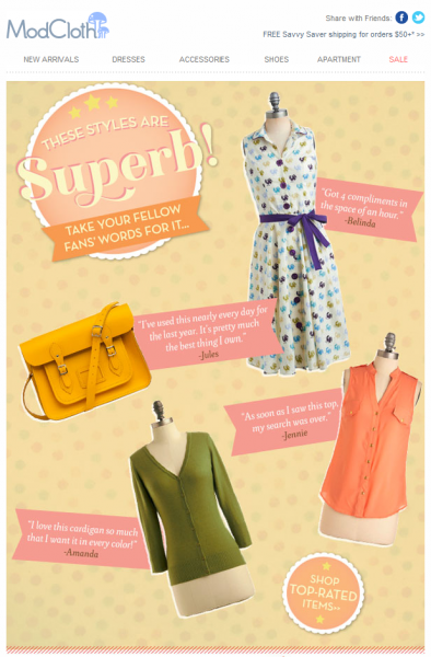 - Создайте стильный дизайн. Элементы дизайна электронной почты важны для рекомендательных писем. Вы хотите что-то привлекающее внимание и легко читаемое. Взгляните на пример ниже. Этот ритейлер собрал четыре цитаты счастливых покупателей и выделил продукт. Это беспроигрышный вариант. И награды, и продукты хорошо представлены в этом простом дизайне.