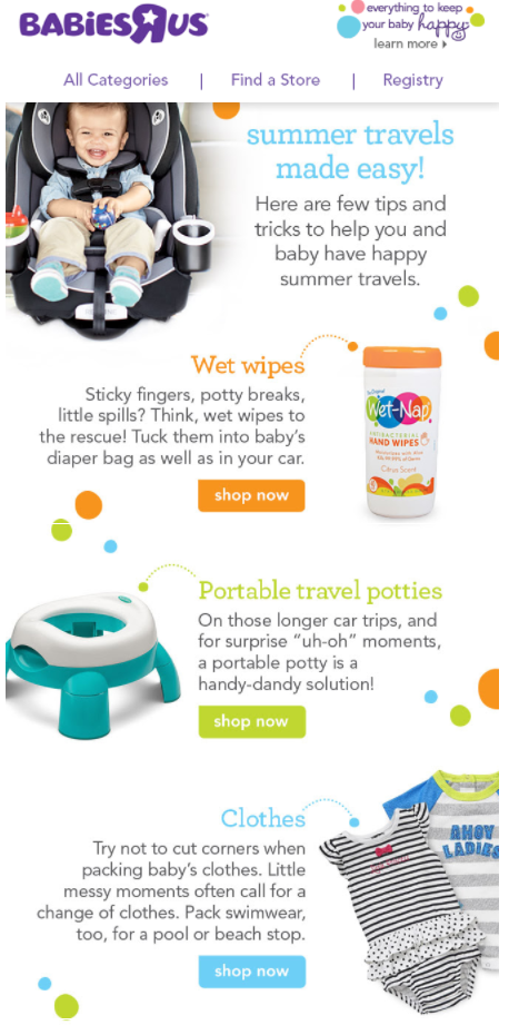 - Создавайте ценный контент. Ключ к этому виду электронной почты состоит в том, чтобы предлагать советы, которые ваши клиенты хотят прочитать. Помогите решить проблемы, которые могут возникнуть, или препятствия, которые им, возможно, придется преодолеть. Или предложите советы, которые помогут вашим клиентам использовать и поддерживать ваш продукт или услугу. Если вы продаете камеры, отправьте электронное письмо, которое научит клиентов, как использовать определенные функции. Если вы продаете сантехнику, включите советы по установке. Каким бы ни был ваш бизнес, создайте электронное письмо, которое поможет вашим клиентам. Компания Babies «R» Us разослала своим клиентам следующее электронное письмо, чтобы помочь им подготовиться к летним путешествиям с детьми.
