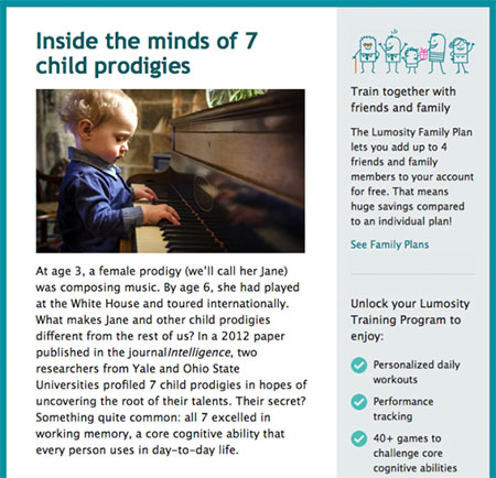 - Добавьте мини-акции. Вы можете добавить в такое письмо рекламный элемент, но он не должен быть главной достопримечательностью. Например, Lumosity, сайт игр для мозга, предлагает образовательную статью в качестве основного материала, но обратите внимание на рекламу с правой стороны для семейного членства. Это тонко и просто.