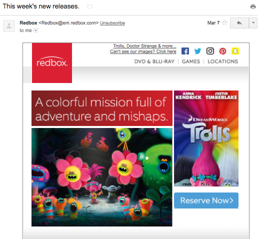 - Передайте суть в строке темы. Вы знаете, что строки темы могут определить, откроет ли ваш клиент ваше электронное письмо или нет, и это электронное письмо ничем не отличается. Обязательно сообщите своим клиентам, что у вас есть что-то новое и интересное для них. Redbox делает это с помощью простой строки темы «Новые выпуски этой недели» в приведенном ниже примере.