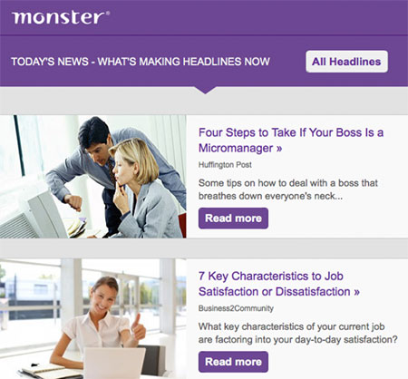 - Предлагайте релевантный контент . Когда вы отправляете образовательное электронное письмо, вы пытаетесь наладить отношения со своими клиентами. Лучший способ сделать это — научить их чему-нибудь. Однако вы хотите научить их тому, что имеет отношение к вашему бизнесу. Например, сайт поиска работы Monster.com отправляет своим клиентам информацию о жизни на рабочем месте. Пример ниже.