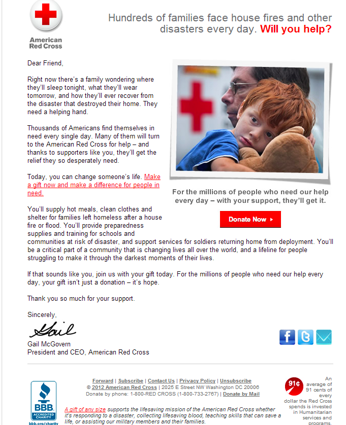 Каждое электронное письмо лучше с картинками, но лучшие изображения включают людей. Эти фотографии могут мотивировать доноров к действию. Используйте фотографии тех, кому вы помогаете, и добровольцев в действии. Старайтесь держаться подальше от общих картинок или стоковых изображений. Вам нужны фотографии реальных людей. Взгляните на электронное письмо Американского Красного Креста ниже. Фотография маленького мальчика составляет целую электронную почту.