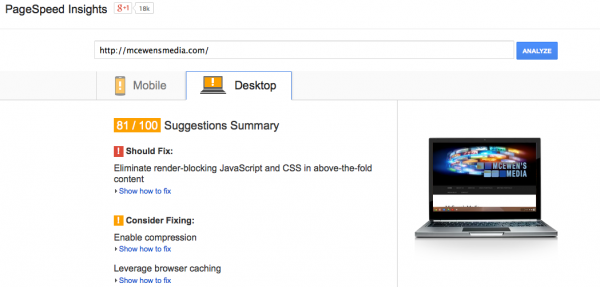- Вы получите рейтинг. В этом случае рейтинг рабочего стола составляет 81/100. Чтобы повысить скорость, он дает вам список вещей, которые вы можете изменить, чтобы ваша страница загружалась быстрее.