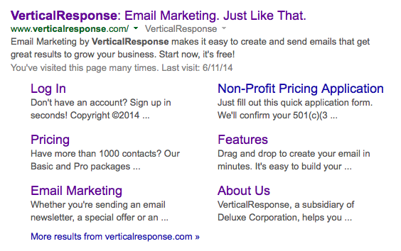 - Вы знаете те дополнительные ссылки, которые появляются под результатами поиска? Они называются ссылками сайта. Например, когда вы ищете «VerticalResponse», вы получаете не только ссылку на главную страницу, но и ряд других ссылок, таких как ссылки «Войти» и «Цены», которые вы видите ниже. Это ссылки на сайты.