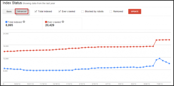 - На вкладке индекса показано количество URL-адресов, найденных ботом. Почему это важная информация? Вы хотите убедиться, что Google может найти и проиндексировать ваш сайт. Постоянное увеличение количества URL-адресов является доказательством того, что Google может найти ваш сайт и каталогизировать его содержимое. Вот хороший пример.