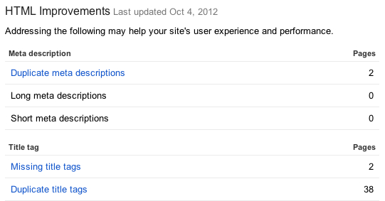 - Если вы можете что-то сделать, чтобы улучшить взаимодействие с пользователем, Google сообщит вам об этом в разделе улучшения HTML. Вот посмотрите, что может появиться: