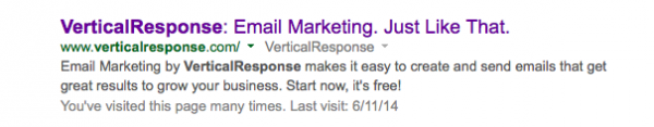 - Вы также увидите предложения тега заголовка. Эти заголовки отображаются как ссылки в поиске. Например, при поиске «VerticalResponse» фиолетовый текст — это тег заголовка и кликабельная ссылка. Эти рекомендации помогут вам точно настроить заголовки, чтобы пользователи, выполняющие поиск, знали, о чем ваш сайт.