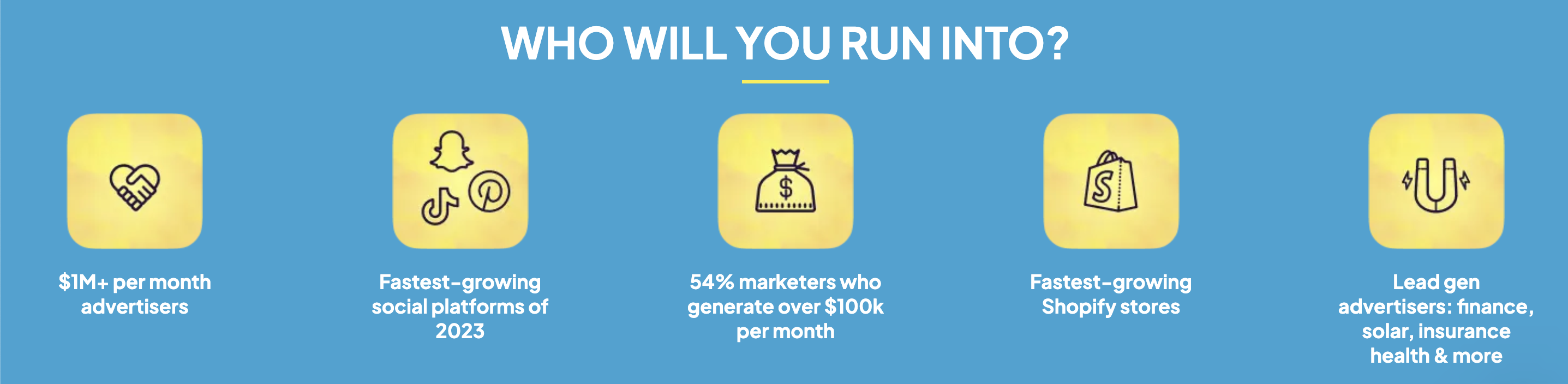 Кроме того, вы никогда не знаете, с кем столкнетесь — будь то рекламодатели, занимающиеся привлечением потенциальных клиентов, ведущие владельцы магазинов Shopify или маркетологи, зарабатывающие более 100 000 долларов в месяц.