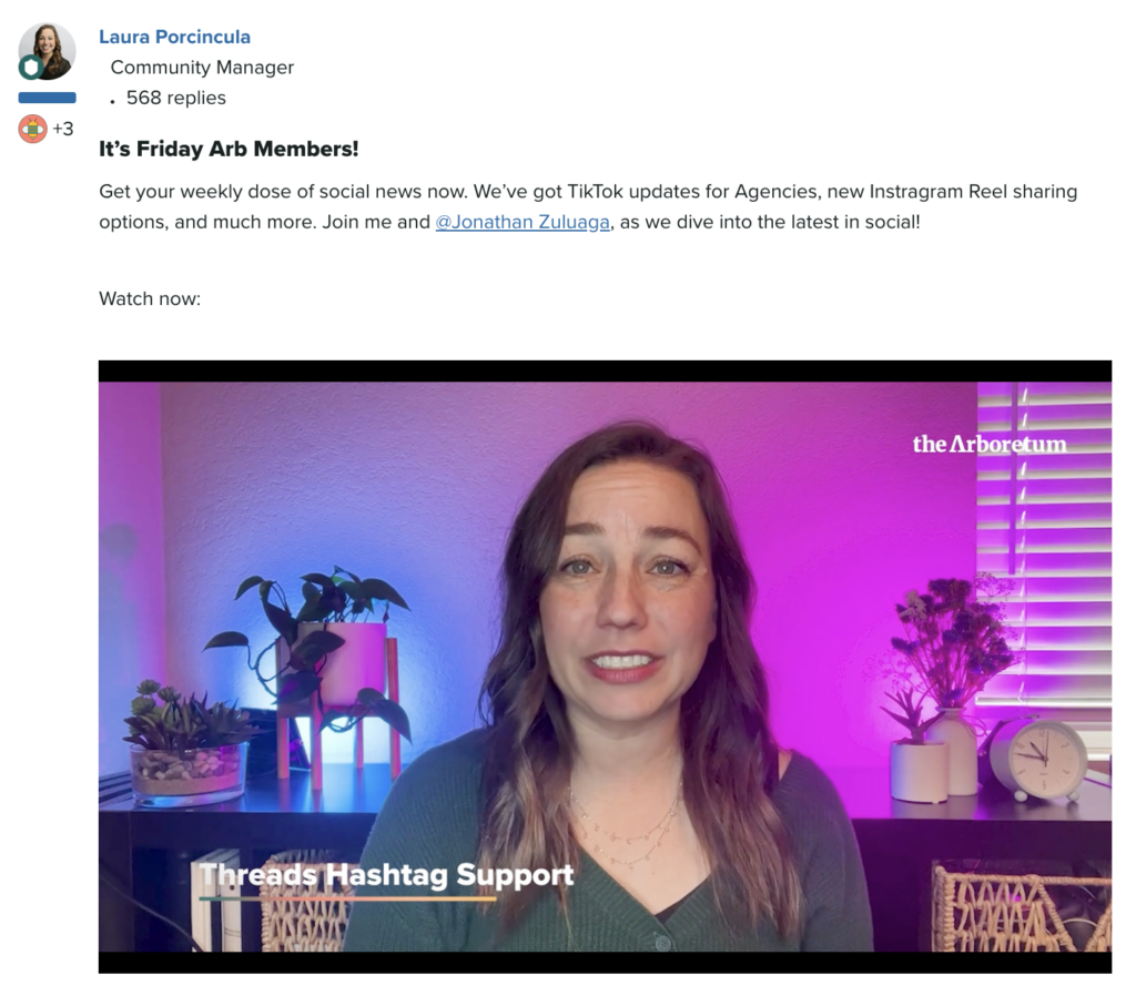 Как менеджеры и лидеры сообществ, мы должны создать ритуалы, которые, как мы надеемся, привьют эту привычку. Вот почему Arb регулярно проводит виртуальные семинары, группы коллег, ежемесячные обзоры участников, пятничные видеоролики «Эта неделя в социальных сетях» и другие точки соприкосновения.