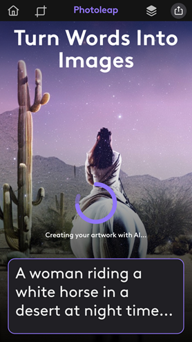 Photoleap позволяет создавать визуальный контент на лету. Чтобы поэкспериментировать с этой функцией, нажмите «Создать AI-изображение» и введите свой текст (например, название вашей статьи).