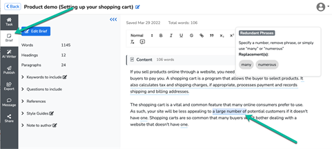 @narratoio использует #AI для составления полуавтоматических сводок #content, говорит @SEOSmarty через @CMIContent. Нажмите, чтобы твитнутьИнструмент также использует проверку грамматики на основе ИИ, чтобы помочь вам (или вашему автору) создать более читаемый и лучше структурированный текст. В этом примере инструмент предлагает заменить «большое количество» на конкретное число или использовать «многие» или «многочисленные».