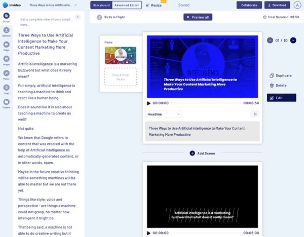 InVideo использует автоматизацию на основе искусственного интеллекта для обеспечения функции преобразования текста в видео. Скопируйте и вставьте несколько абзацев из своей статьи и загрузите свой логотип. Инструмент предложит видео, включая шаблон, анимацию и заголовки. Вы можете отредактировать видео, если хотите.