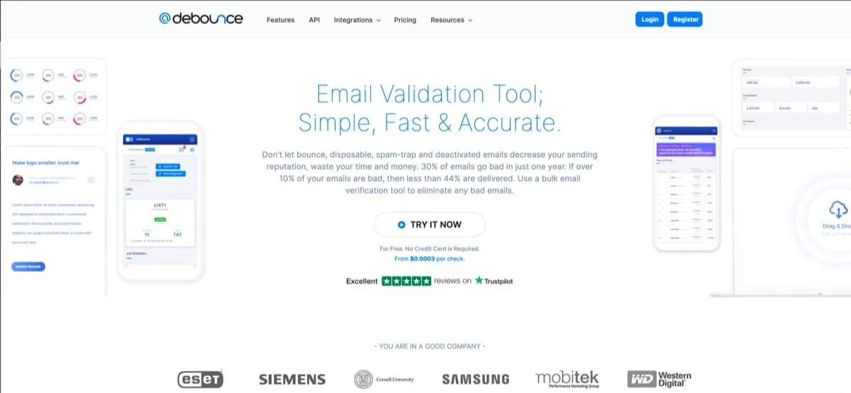 DeBounce - это ваше идеальное решение для проверки электронной почты с массовой проверкой, API для проверки отдельных и массовых писем, плагином WordPress, простым в установке виджетом JavaScript в реальном времени и многими другими интеграциями.