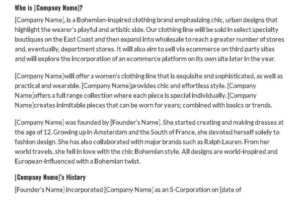 Эта часть должна представить читателям вашу линию одежды, коснувшись ценностей и целей, которые делают ваш бренд уникальным. Подтемы могут включать в себя подробную хронологию истории вашей компании, кому принадлежит бизнес, и будет ли ваш модный бренд работать в основном в Интернете или в обычном месте. Если вы ищете финансовую поддержку для открытия нового офиса, обсудите, как расширение может способствовать увеличению продаж и ускорению роста.