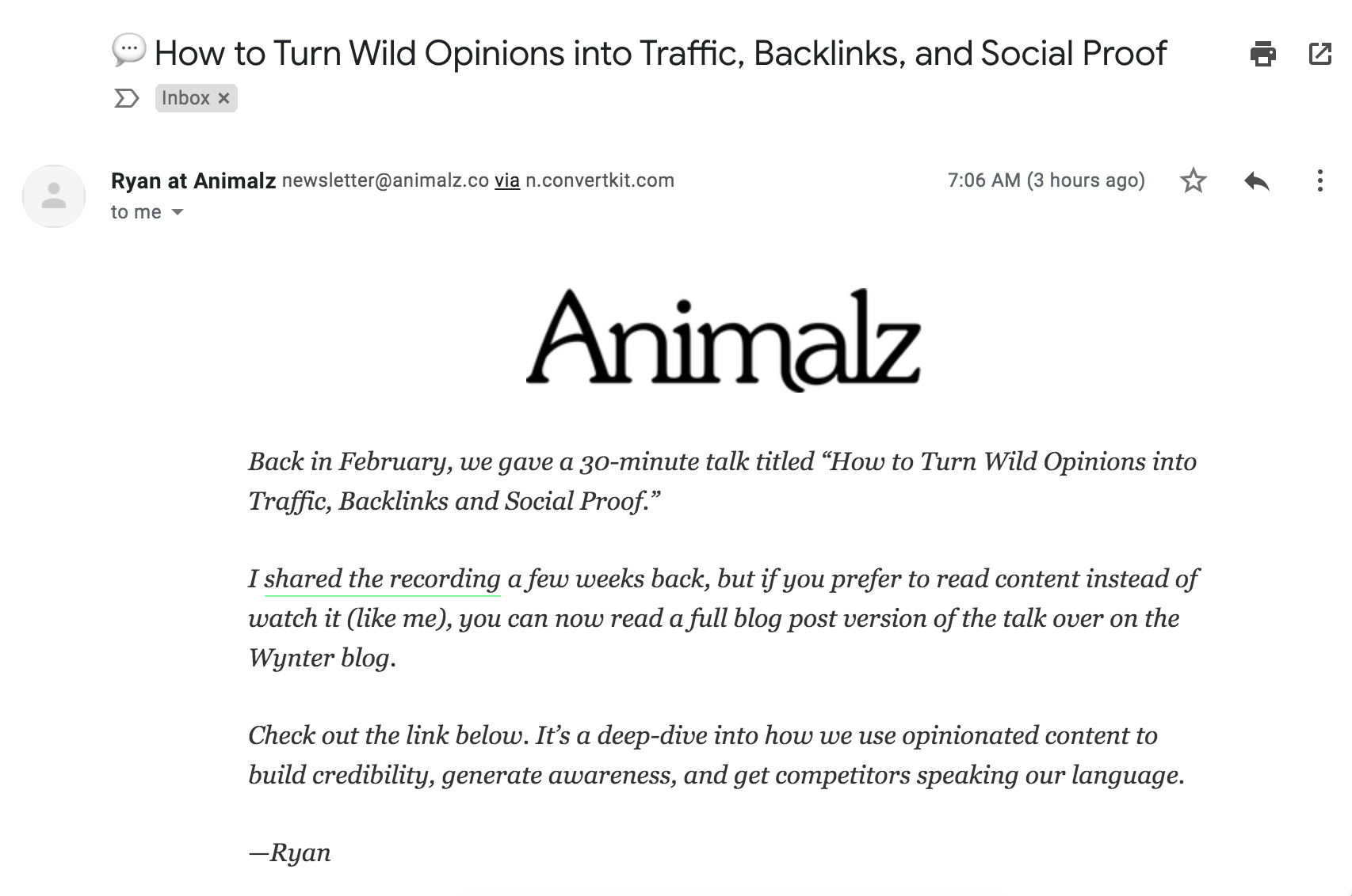 Маркетологи по электронной почте с Animalz знают, что движет их аудиторией, и позиционируют это письмо как центр информации о трафике, обратных ссылках и социальных доказательствах.