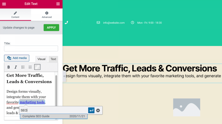 При создании нового контента разумно по возможности ссылаться на старый контент. Этого легко добиться в Elementor. Всякий раз, когда вы создаете URL-адрес, Elementor автоматически предлагает соответствующий контент, на который вы можете ссылаться: