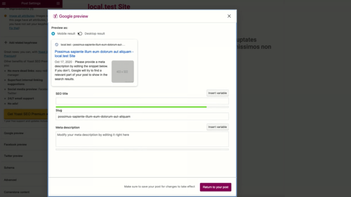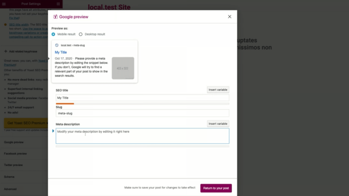 Вы можете создать уникальное описание для каждой страницы или сообщения с помощью Yoast SEO или Rank Math. Если вы используете Yoast SEO, у вас будет дополнительная возможность обновлять несколько описаний одновременно с помощью массового редактора Yoast SEO. Вы можете получить доступ к этому массовому редактору, перейдя в SEO > Инструменты > Массовый редактор > Описание :
