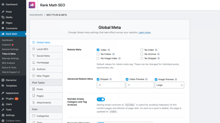 С помощью Rank Math вы можете выбрать тип схемы по умолчанию, который будет отображаться в определенных типах контента. Вы найдете эти глобальные настройки схемы, перейдя в Rank Math > Titles and Meta :