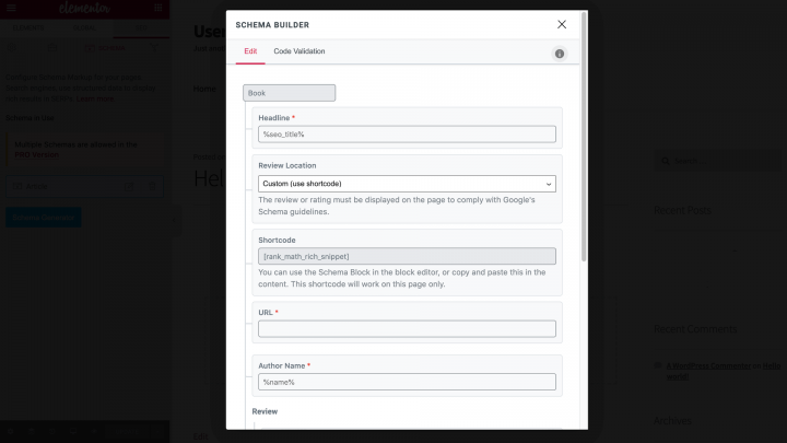 Выбрав эту вкладку, нажмите Edit Snippet . Это запускает редактор фрагментов Rank Math прямо в пользовательском интерфейсе Elementor: