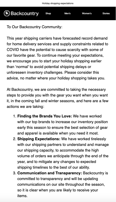 Вместо того, чтобы ждать, как пройдет сезон доставки, Backcountry избегает «возгласов», возлагая на свое сообщество справедливые ожидания: если вы хотите купить снаряжение, которое вы знаете и любите, вам лучше сделать это как можно скорее, потому что нет никакой гарантии, что оно будет в наличии. запас позже.