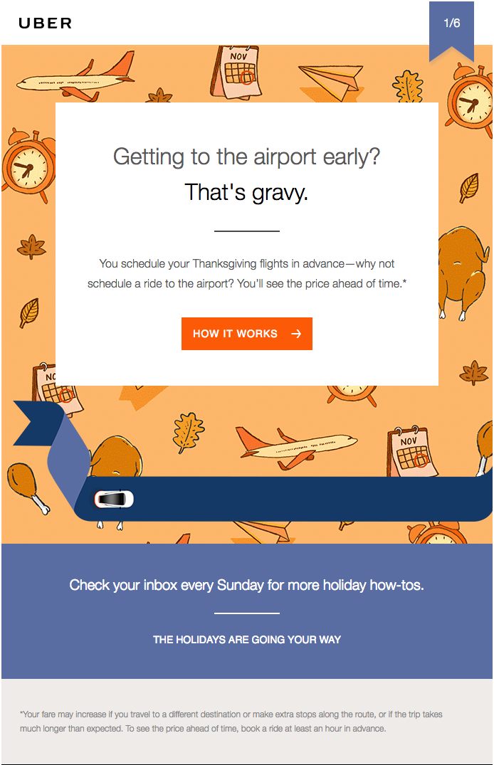 Частота — один из важнейших элементов успешной рассылки праздничных писем. В правом верхнем углу он показывает 1/6. Внизу Uber советует проверять каждое воскресенье, чтобы получить более полезные праздничные советы. Этот запланированный план из 6 электронных писем, 1 в неделю, устанавливает ожидания с начала серии электронных писем. Вместо того, чтобы ежедневно заваливать вас предложениями по электронной почте, Uber стремится обеспечить качество, а не количество.
