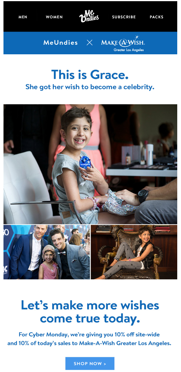 Вместо того, чтобы продвигать рекламные предложения и говорить о своих ультракомфортных продуктах, он сосредотачивается на Грейс, 11-летней девочке, больной раком, которая хочет стать знаменитостью. Подталкивание MeUndies к веб-сайту заключалось в том, чтобы делать покупки в Cyber ​​​​Monday со скидкой 10%, при этом 10% продаж пошли в фонд Make-A-Wish Foundation.