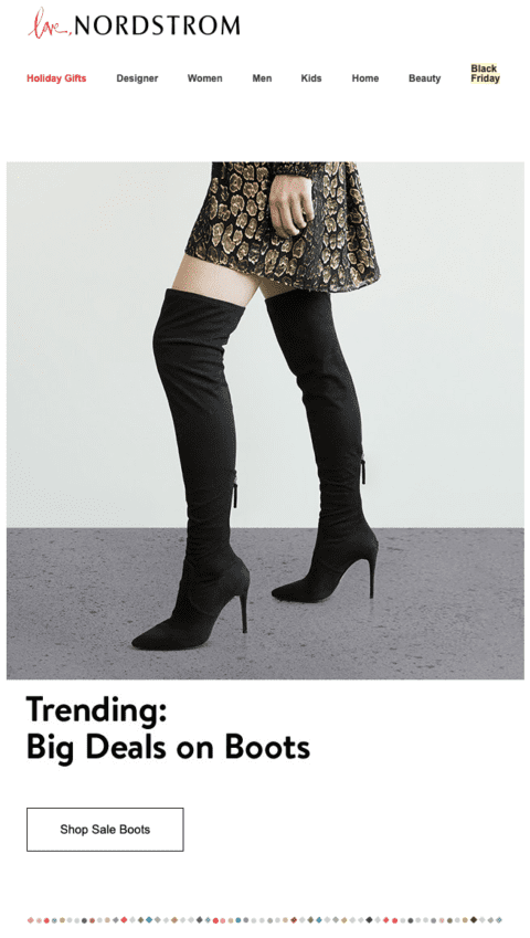 Этот пример праздничного электронного письма от Nordstrom привлекает внимание к Черной пятнице, потому что в теме письма прямо говорится о предложении: «Скидка до 60% на обувь». И когда на него нажимают, он обеспечивает именно то, что и было обещано.