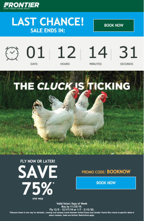 Frontier закрепляет стратегию срочности своим электронным письмом «Кукушка тикает». Это весело, своевременно и побуждает клиентов быстро принимать решение. Призывы к действию ясны и очевидны, а тема письма «Не расстраивайтесь из-за 75-процентной скидки на рейсы!» прекрасно связывает все вместе.