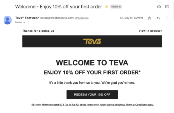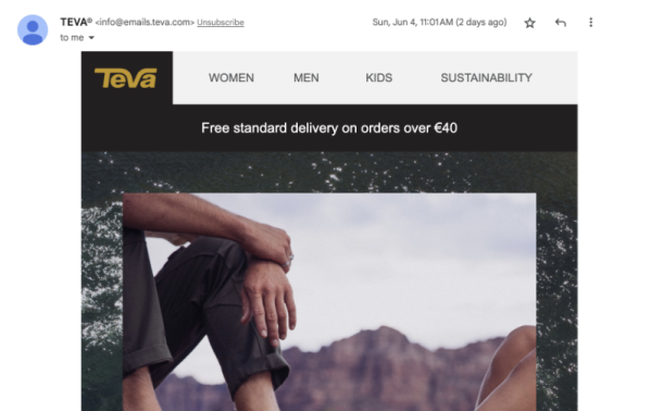 В сообщении вы можете поделиться тем, что лиды/клиенты могут ожидать от вашего списка рассылки. С этим письмом не нужно ничего продавать. Вместо этого в моем приветственном письме объяснялось, что бренд Teva произносится как «те-ва», а не как «ти-ва». Я узнал, что эти спортивные сандалии существуют с 1984 года. Они даже предложили мне подписаться на них в социальных сетях, чтобы узнать больше.