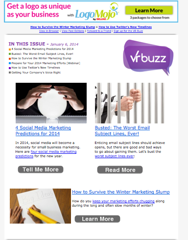 Вот пример того, как мы обновили наш информационный бюллетень VR Buzz с 2014 по 2017 год. Мы разделили макет на блоки с удобным для чтения контентом, добавили больше цветов, чтобы выделить каждый блок текста и наши CTA, и удалили таблицу. содержимого, которое может отвлекать от наших CTA.