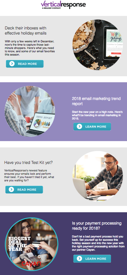 Как только вы почувствуете поведение и тенденции ваших читателей, используйте это в своих интересах и обновите дизайн своего информационного бюллетеня. Ваш логотип вверху большой и отодвигает ценный контент вниз? Сделайте его меньше. Нажимают ли ваши клиенты на текстовые ссылки? Включите интерактивные заголовки, сделайте их большими или более заметными. Разделы вашей статьи длинные? Сделайте их меньше и используйте шаблон с не более чем двумя столбцами на дизайн, чтобы улучшить просмотр на мобильных устройствах. Текстовые ссылки не пользуются большой популярностью? Попробуйте включить кнопки призыва к действию в каждый раздел вместо этого или в дополнение.