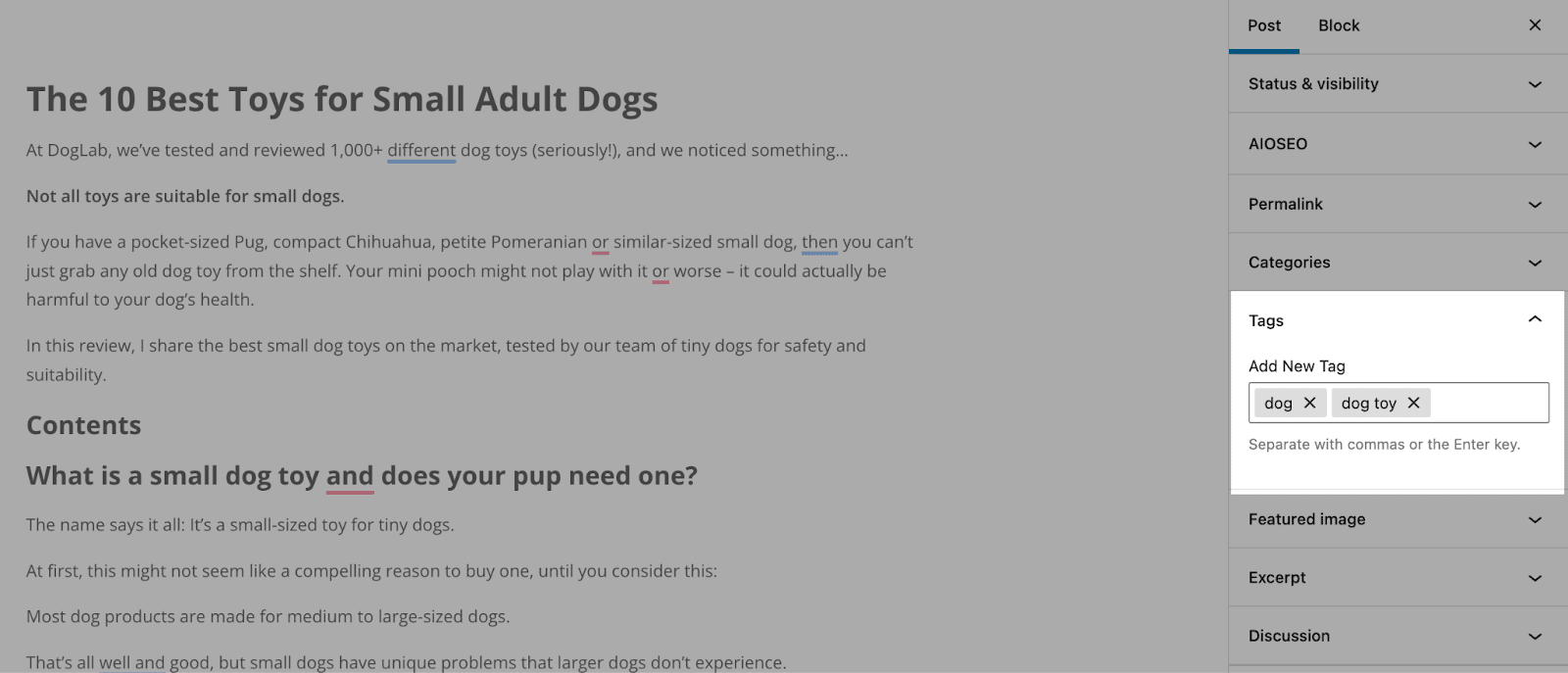Перейдите на панель инструментов WordPress и убедитесь, что вашей статье (в данном случае «Лучшие игрушки для маленьких взрослых собак») присвоены соответствующие теги (например, «собака»).