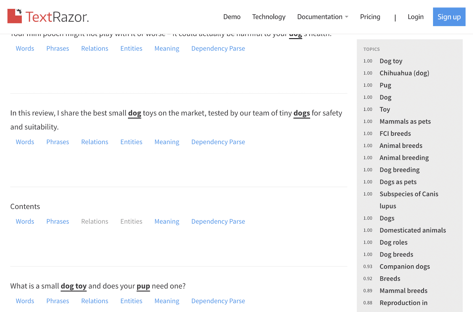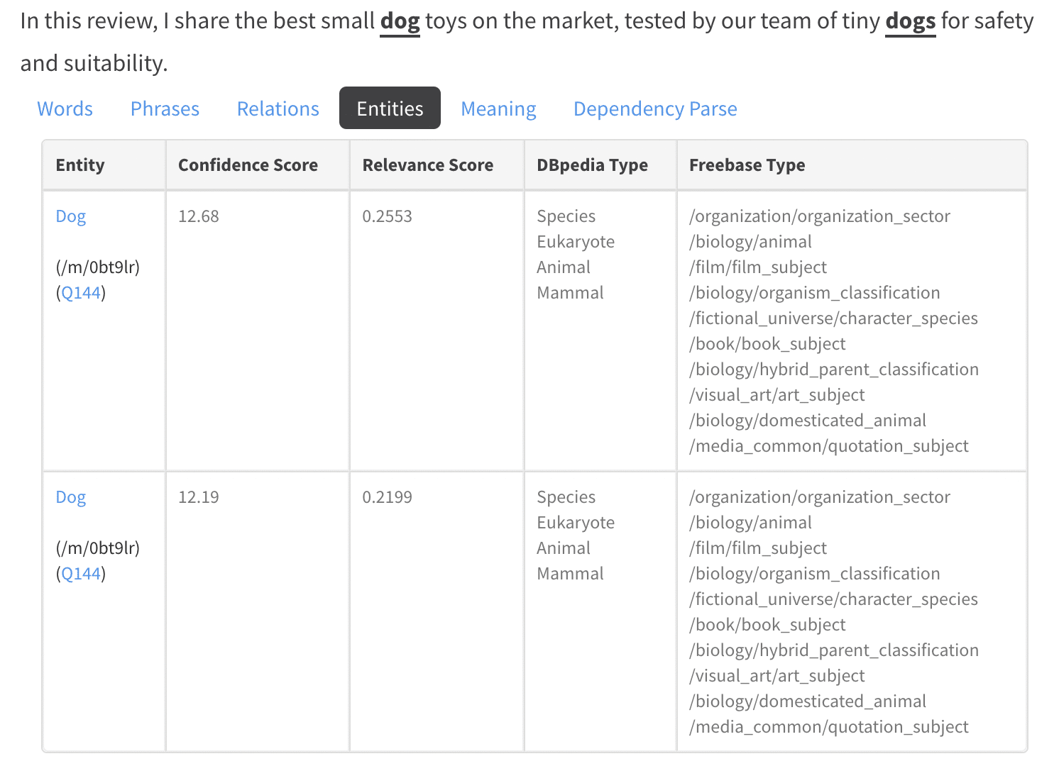 Затем щелкните вкладку «Сущности» под предложением, содержащим слово «собака». Это отобразит список всех сущностей в этом конкретном предложении.