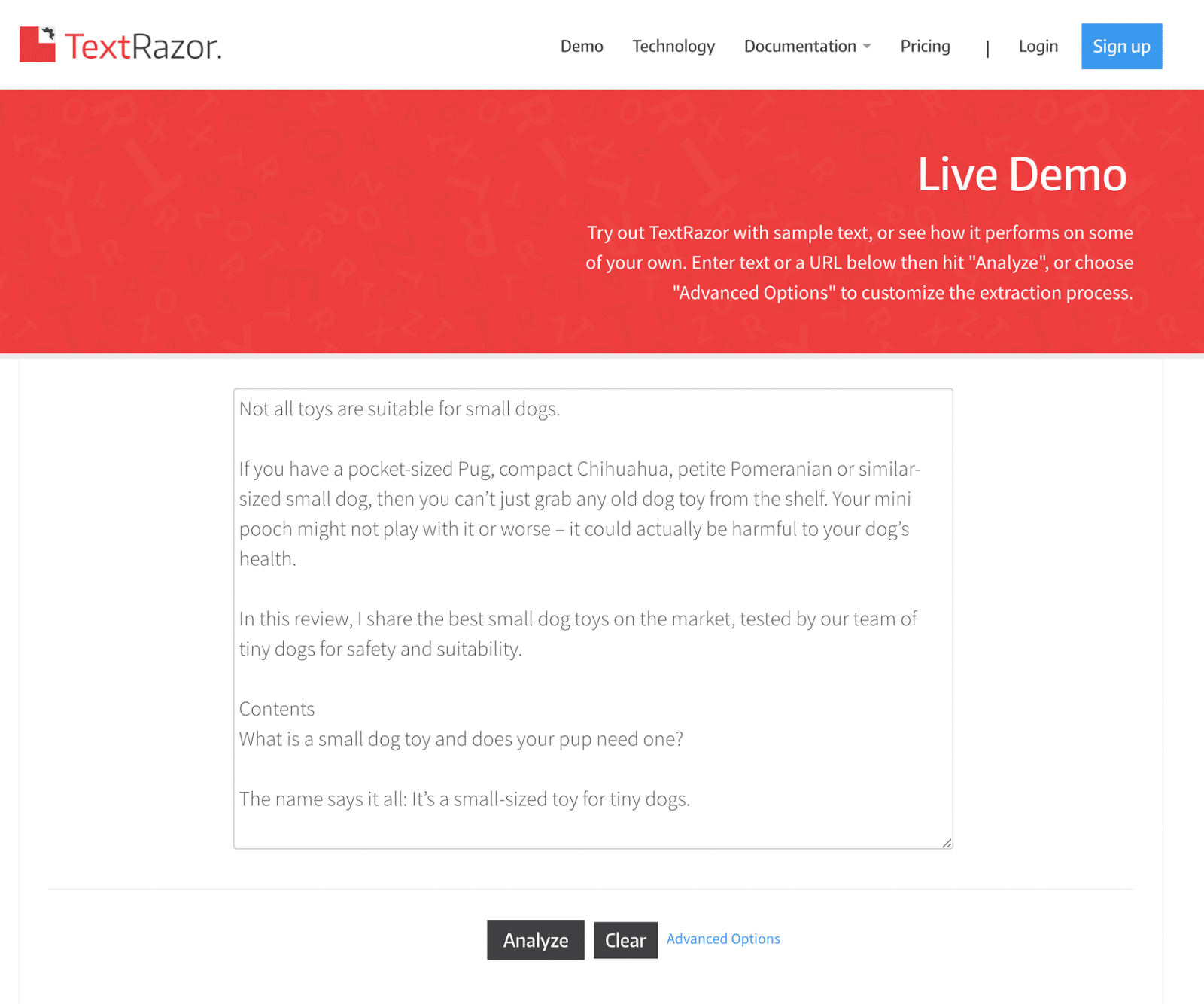 Начните с копирования и вставки текста вашей статьи в демо-версию TextRazor и нажатия кнопки «Анализ».