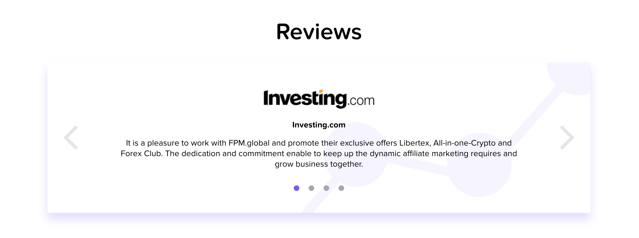 Основная цель FPM.Global — способствовать развитию прочных партнерских отношений, предлагая исчерпывающую информацию и обеспечивая прозрачность, что позволяет аффилированным лицам максимизировать свои доходы.