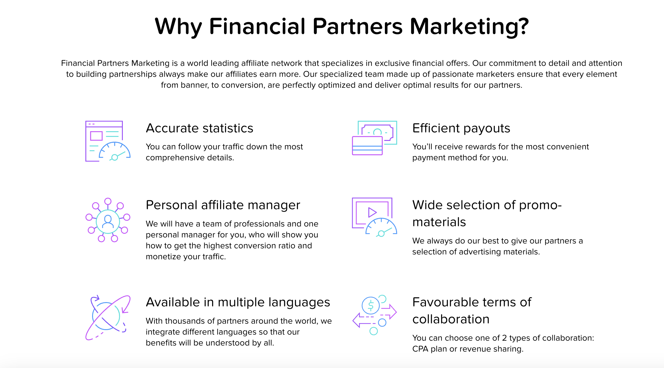 Financial Partners Marketing (FPM.Global) предлагает выгодные условия сотрудничества, позволяя аффилиатам выбирать между двумя типами сотрудничества: планом CPA (Cost Per Action) или распределением доходов.