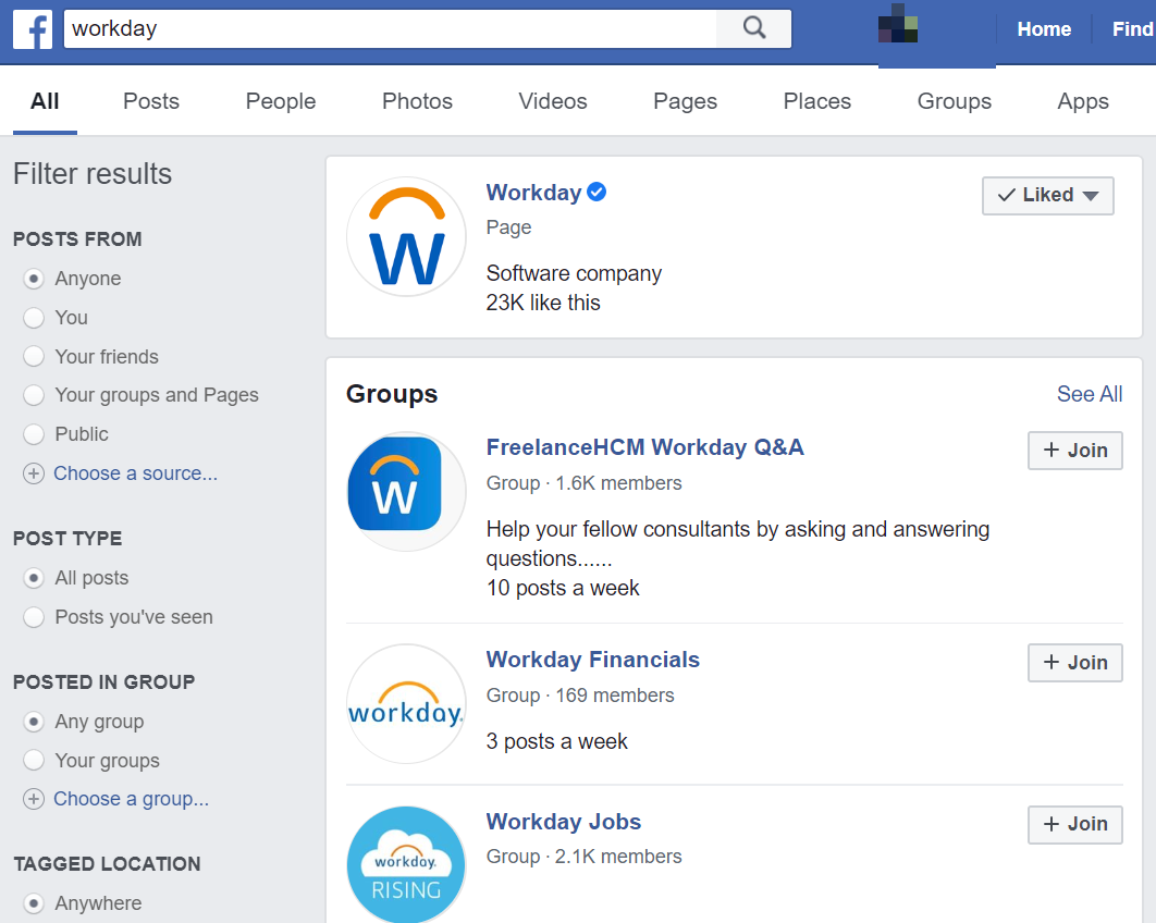 Кроме того, Facebook отдает приоритет проверенным профилям и страницам в результатах поиска. Таким образом, проверка Facebook гарантирует, что ваша Страница будет отображаться в верхней части релевантных поисковых запросов, что может еще больше увеличить охват. Посмотрите, как официальная подтвержденная страница Workday получает наивысший приоритет при поиске названия компании на Facebook.