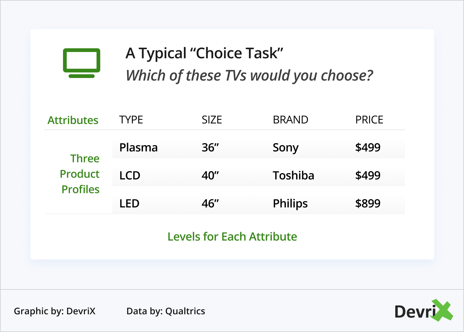 Наиболее популярным типом совместного анализа является дискретный выбор . Он призван имитировать реальный опыт покупки, когда покупатель сталкивается с рядом вариантов выбора.