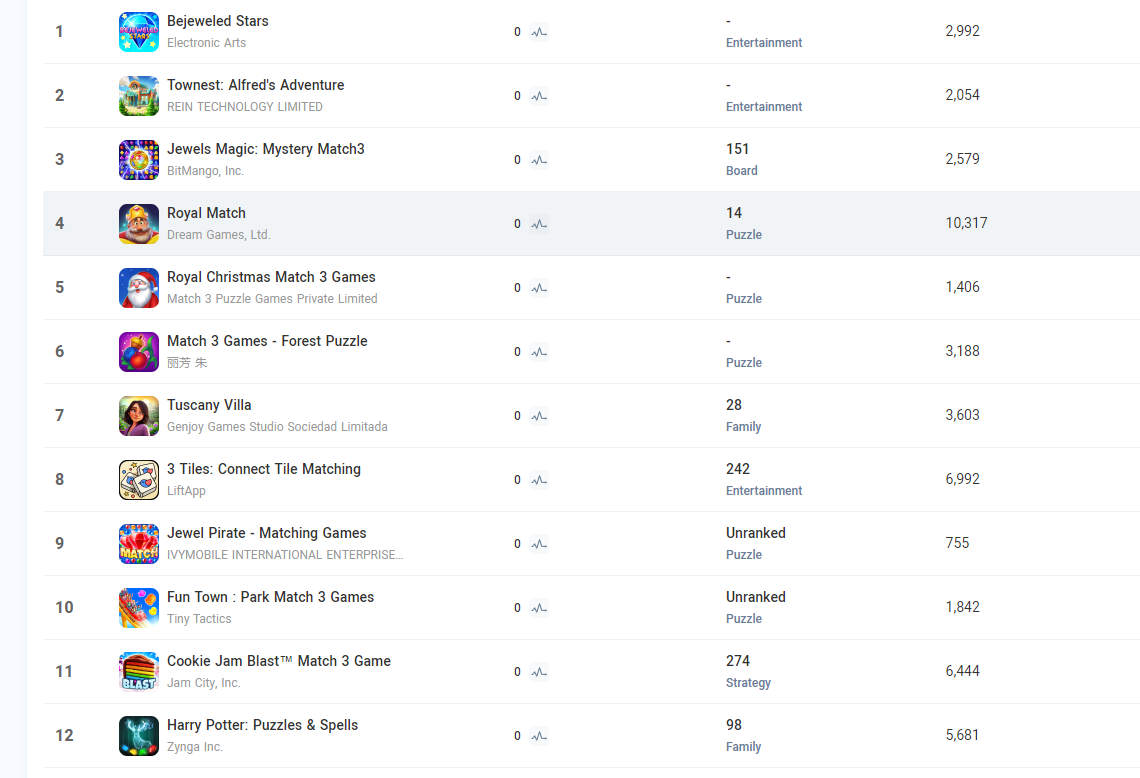 Из значков только две (Jewels Magic и 3 Tiles) показывают свое игровое поле, чтобы сразу подчеркнуть, что они представляют собой игры «три в ряд». Тот факт, что только в нескольких играх используется эта стратегия, говорит о том, что сегодняшние игроки могут меньше искать конкретную игру «три в ряд» и больше повествование или историю, окружающую ее.