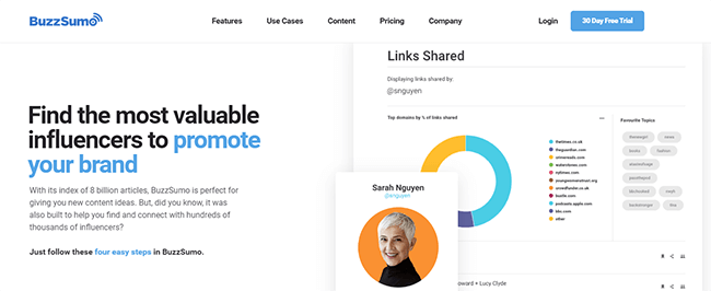 Если вы хотите найти инфлюенсеров на других платформах, таких как Twitter, YouTube и Facebook, обязательно ознакомьтесь с BuzzSumo.