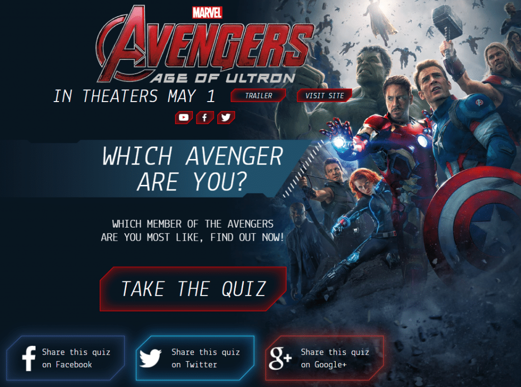 Чтобы совпасть с запуском нового выпуска «Мстителей», команда Marvel создала интерактивную викторину, чтобы помочь кинозрителям решить, какой из персонажей им ближе всего.