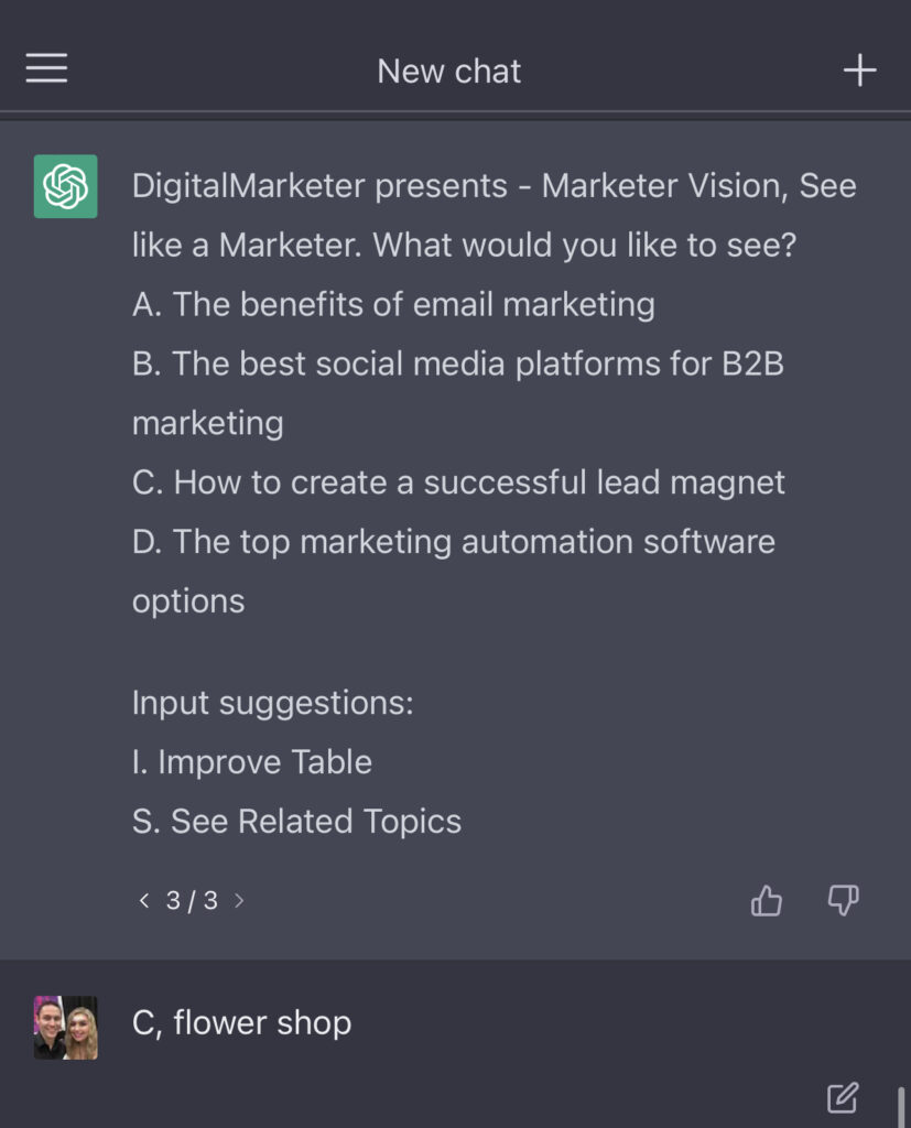 Рассмотрим ChatGPT, имя которого Marketer Vision.