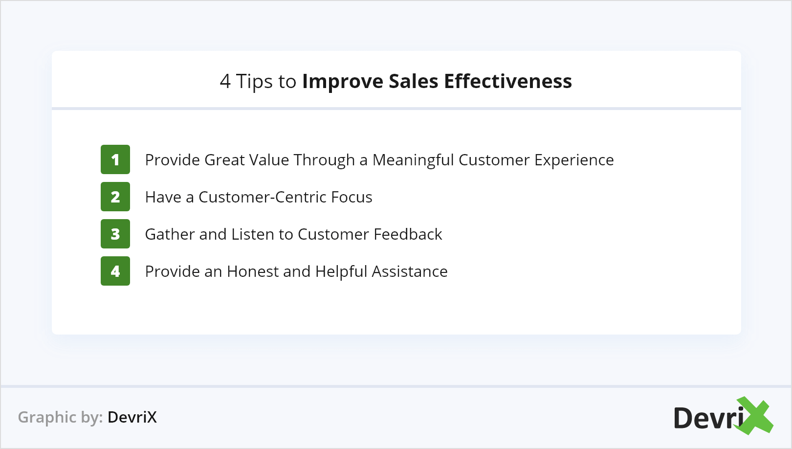 Когда ваши представители пытаются помочь, вы можете значительно улучшить качество обслуживания клиентов. Клиенты могут определить, когда торговый представитель заинтересован только в продаже, поэтому вам нужно быть искренним в общении с клиентом. Вы должны быть прозрачными и показывать, что активно работаете над удовлетворением их потребностей.