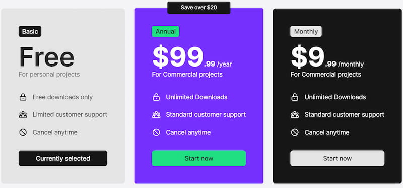 Ежемесячный план составляет 9,99 долларов в месяц. Он поставляется с неограниченным количеством загрузок, и вы можете использовать их в коммерческих проектах. Годовой план включает те же функции по цене 99,99 долларов в год. Как ежемесячные, так и годовые планы имеют стандартную поддержку клиентов.